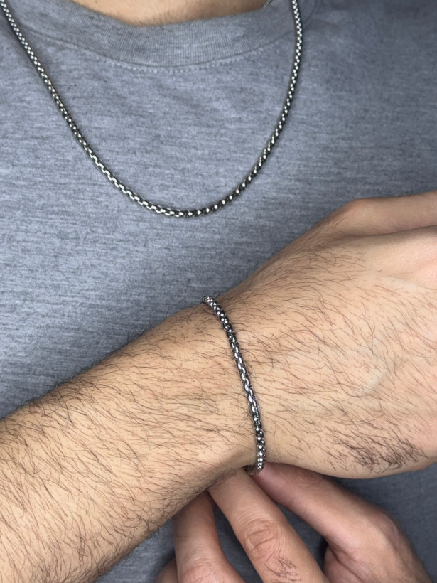این ست در دسته Industrial Minimal Jewelry قرار میگیرد. نقطه قوت اصلی آن، یکنواختی دقیق بافت زنجیر و تناسب ابعاد بین دستبند و گردنبند است. این هماهنگی باعث میشود ست نه شلوغ به نظر برسد و نه سادهی بیهویت.