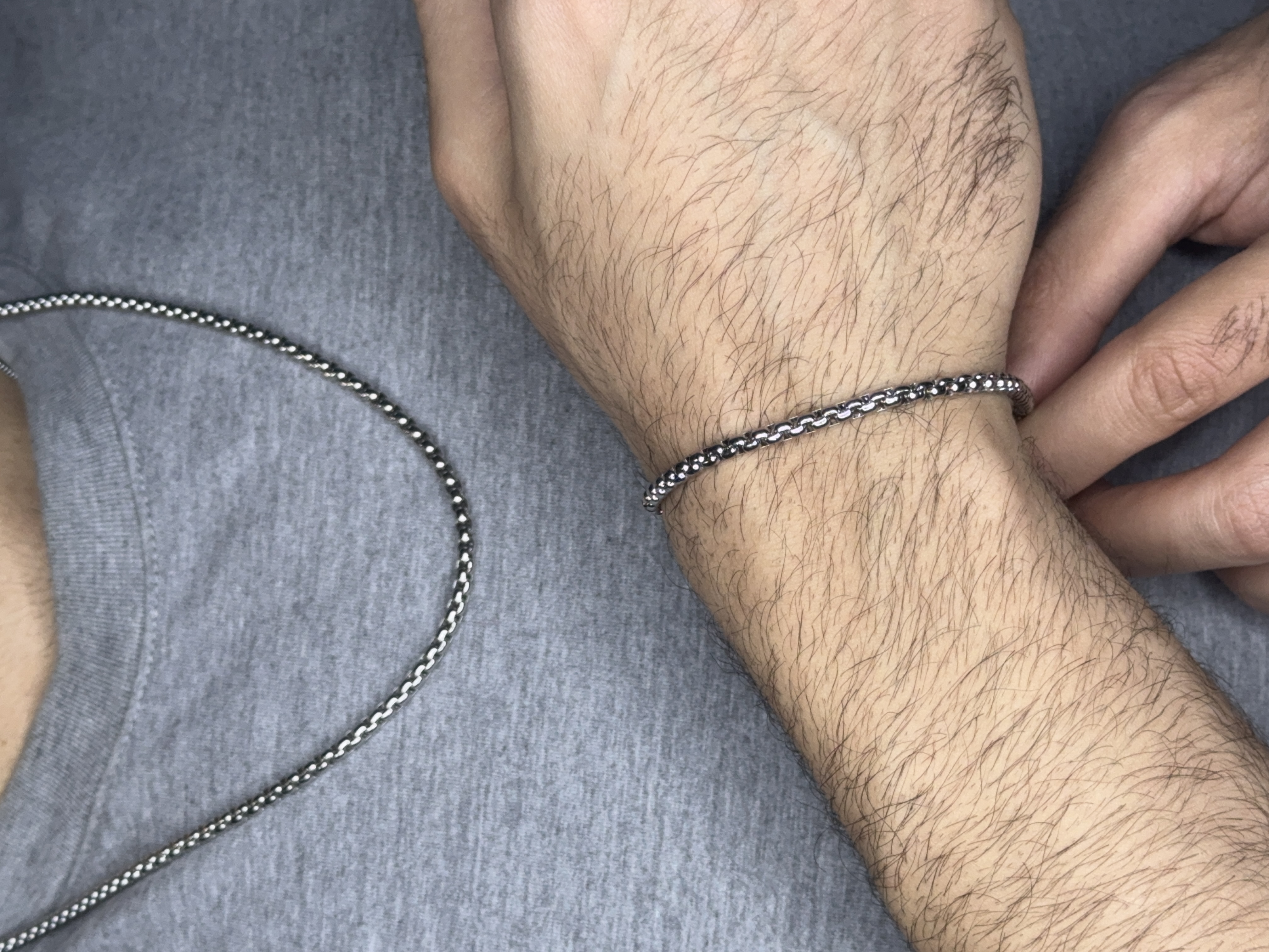 این ست در دسته Industrial Minimal Jewelry قرار میگیرد. نقطه قوت اصلی آن، یکنواختی دقیق بافت زنجیر و تناسب ابعاد بین دستبند و گردنبند است. این هماهنگی باعث میشود ست نه شلوغ به نظر برسد و نه سادهی بیهویت.
