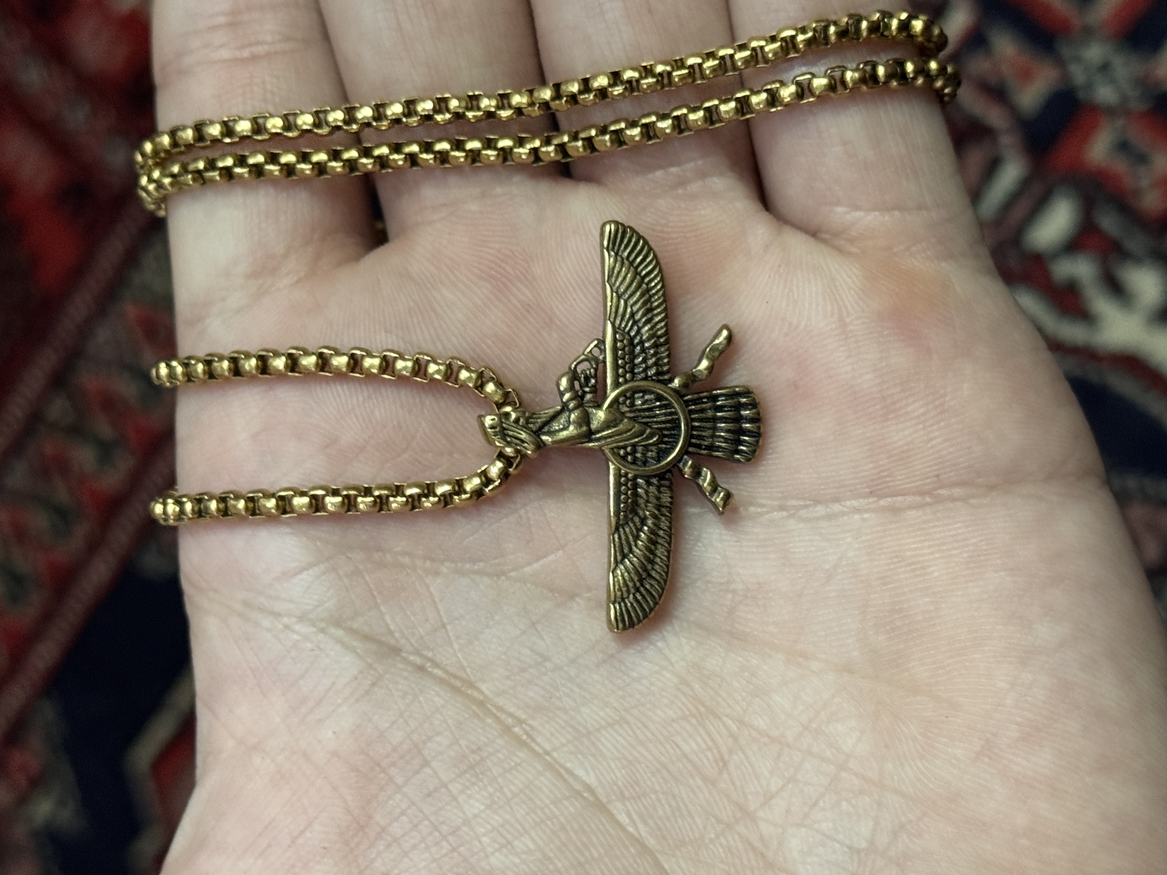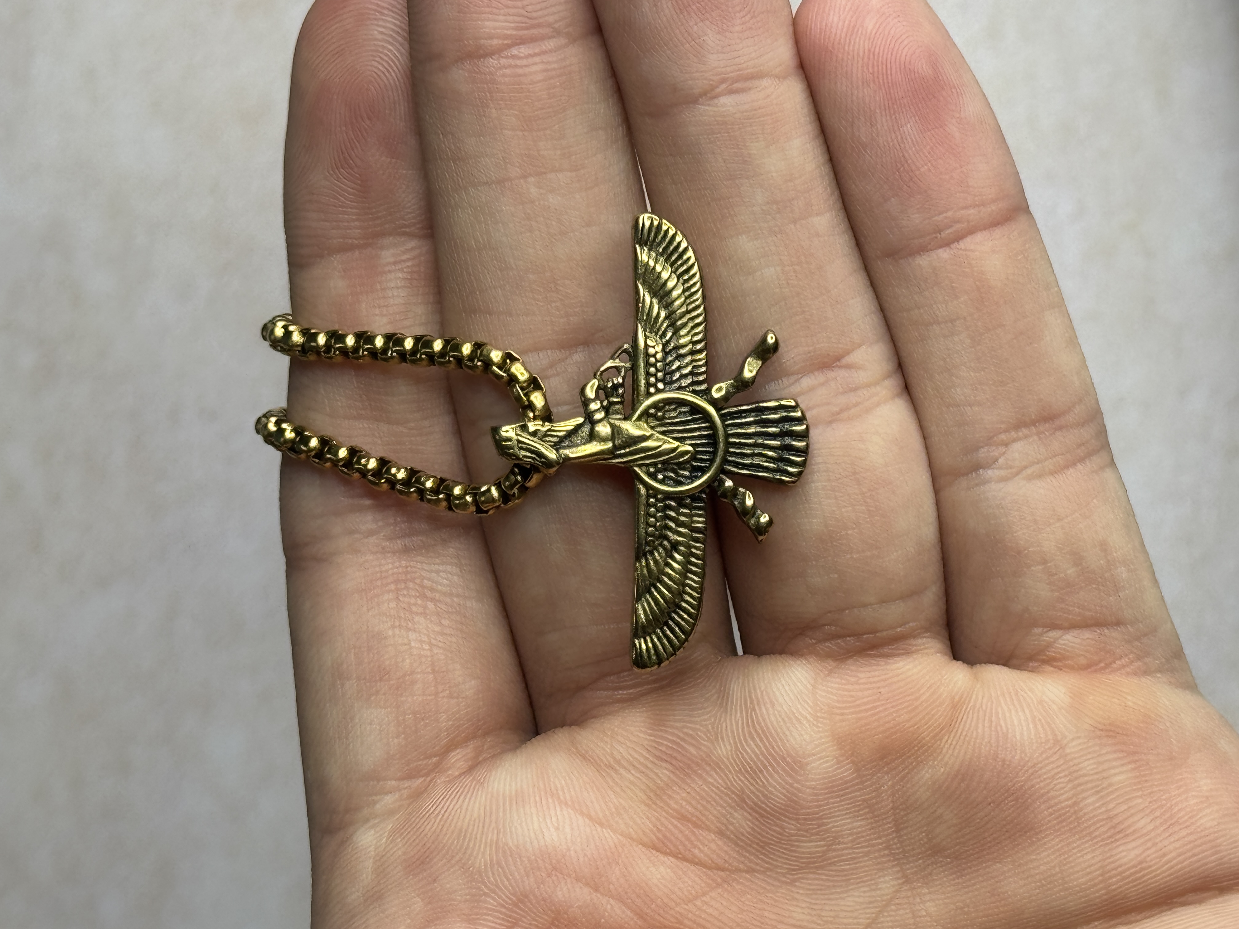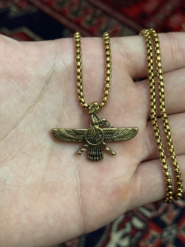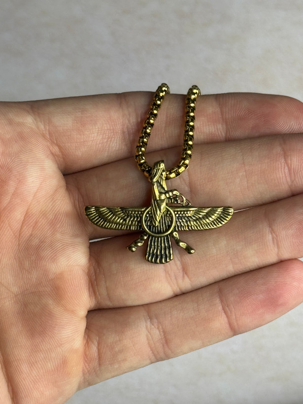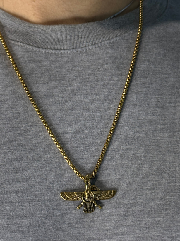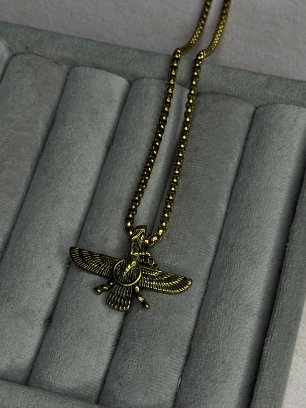جزئیات بالها و حلقه مرکزی فروهر با دقت خوبی اجرا شده و وزن پلاک بهگونهای است که هنگام استفاده طولانیمدت آزاردهنده نیست. انتخاب دو رنگ طلایی و نقرهای، امکان ست شدن با استایلهای مختلف را فراهم میکند.