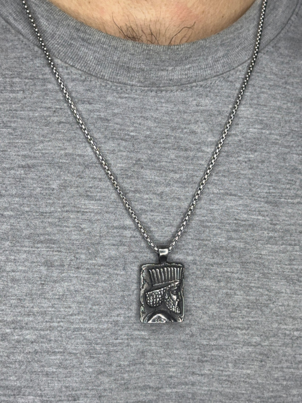 چهره حکاکیشده با خطوط عمیق و پرداخت مات–قدیمی، حس سنگی و تاریخی دارد و یادآور نقشبرجستههای هخامنشی است.