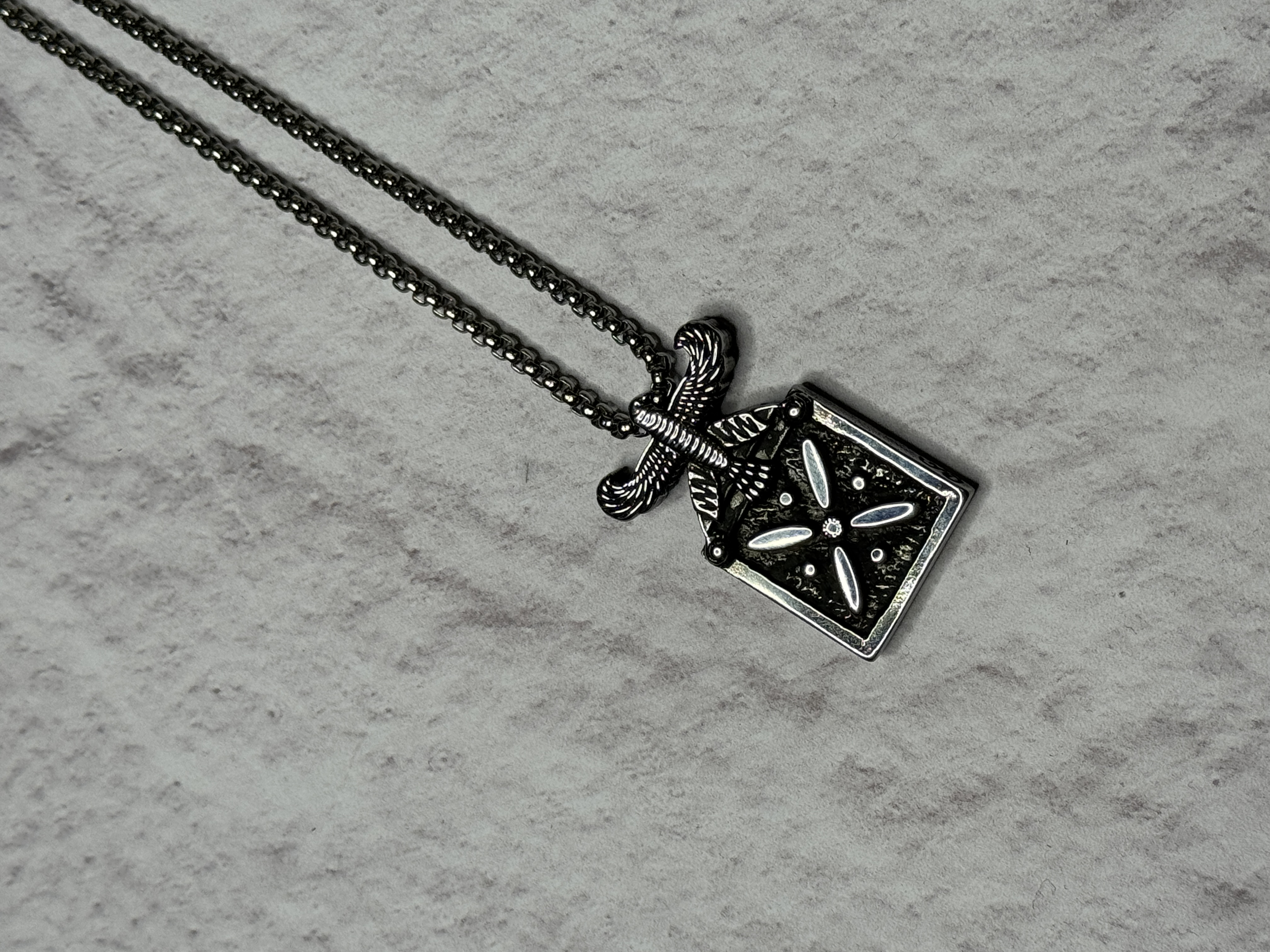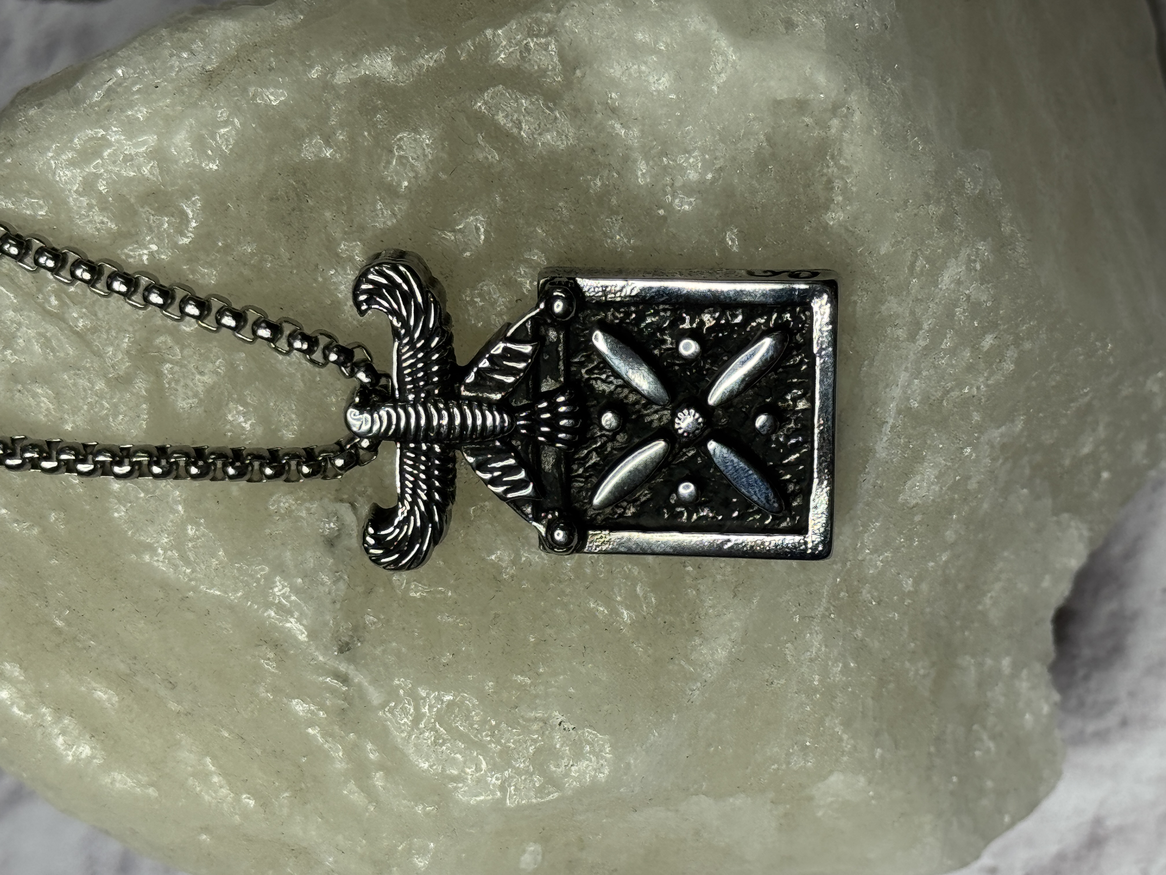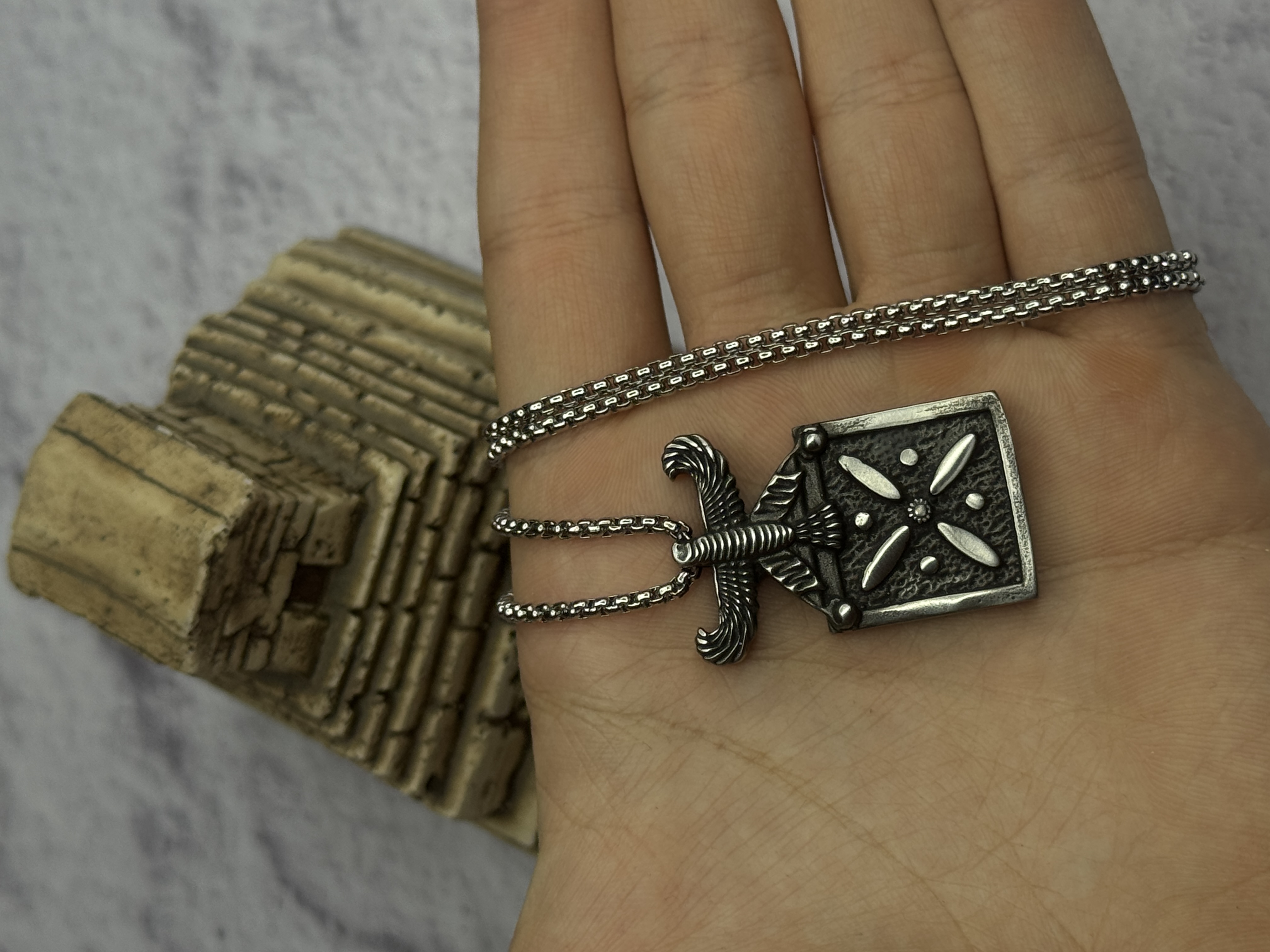پرداخت فلز، عمق نقشها و کنتراست سطح مات و برجسته، حس یک شیء تاریخی بازآفرینیشده را ایجاد میکند.