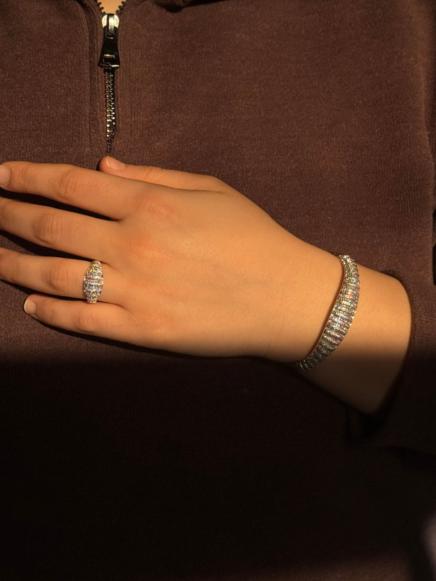 مهمترین ویژگی این ست، هماهنگی کامل دستبند و انگشتر در طراحی و درخشش است. ردیف کامل نگینها جلوهای پرنور ایجاد میکند و ترکیب آن با استیل براق باعث شده ظاهر آن بسیار نزدیک به جواهرات ظریف باشد.